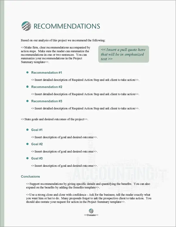 Proposal Pack Accounting #1 is a specialty graphic logo design which accents our entire collection of over 2200 business proposal templates. You get a custom design theme consistently integrated through every page of your proposal. We have done most of the work for you already - pre-written proposal letters, contracts and documents complete with graphic designs and title page backgrounds and sample proposals which show you how to create yours.