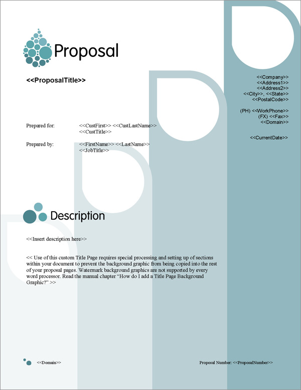 Proposal Pack Aqua #3 is a specialty graphic logo design which accents our entire collection of over 2200 business proposal templates. You get a custom design theme consistently integrated through every page of your proposal. We have done most of the work for you already - pre-written proposal letters, contracts and documents complete with graphic designs and title page backgrounds and sample proposals which show you how to create yours.