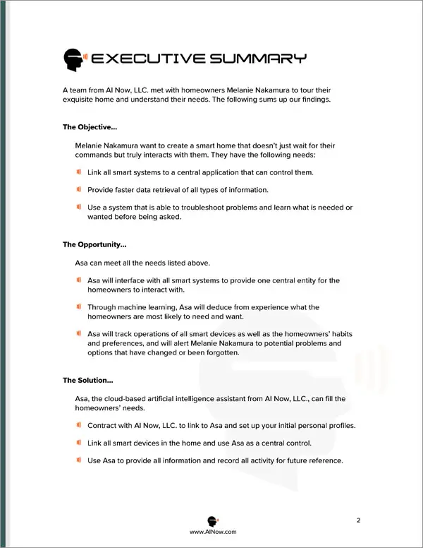 They have found the smart listening devices to be limited in supplying information, and the hubs don’t always work well with other devices or signal the homeowners when something is wrong. Melanie and David Nakamura want a system that will learn their habits, identify problems, and generally make their lives easier. AI Now, LLC. plans to meet the following goals and objectives.