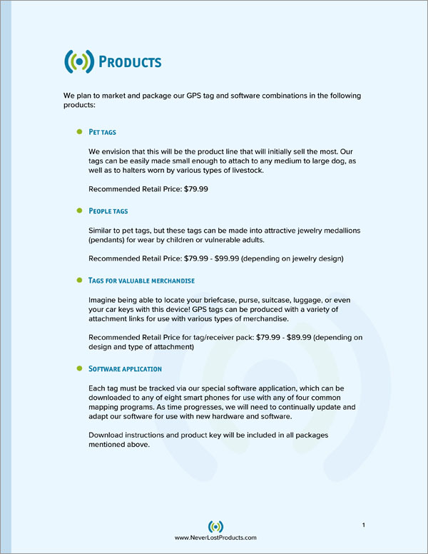At NeverLost Products, we have developed a new small tag that contains a GPS transmitter. We have combined this tag with software that can be downloaded to any smart phone and then used to track the tag. This combination can be manufactured and sold in a package costing less than $25, and we believe that consumers would gladly pay as much as $80 for each package.