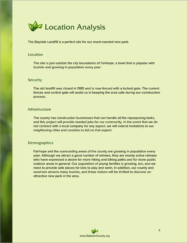 This new park will include trails for hikers and bikers, a wildlife area, a playground and ball fields, a swim beach, and a boat launch facility. Our plan is described in the following pages. The Bayside Landfill is a perfect site for our much-needed new park. The site is just outside the city boundaries of Fairhope, a town that is popular with tourists and growing in population every year.