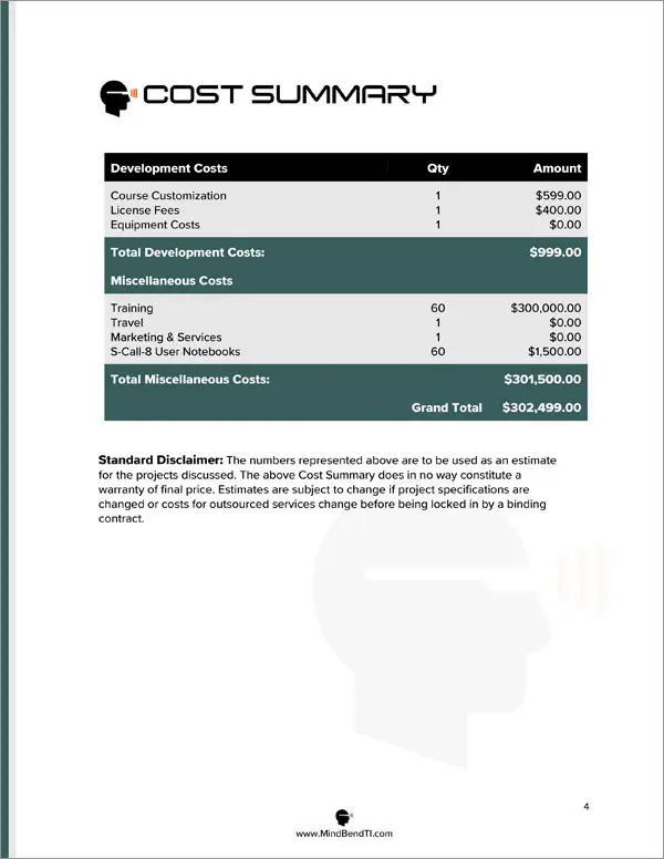 The numbers represented above are to be used as an estimate for the projects discussed. The above Cost Summary does in no way constitute warranty of final price. Estimates are subject to change if project specifications are changed or costs for outsourced services change before being locked in by binding contract. Over period of six weeks MindBend Training Institute will train AB Call Company’s employees in the use of the Call software system.