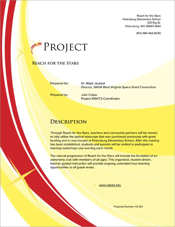 The use of speakers field trips and hands on activities will provide students with the opportunity to aggressively explore the link between space science and technology. Reach for the Stars student activities will address at the appropriate grade levels the West Virginia Instructional Goals and Objectives National Education Goals National Science Education Standards and the International Society for Technology in Education Standards. Teachers will be provided with resources to supplement their current curriculum through WVU NASA Ames IV & Facility offerings and training provided by the staff at Greenbank National Radio Astronomy Observatory. Internet based resources will be identified compiled and presented to staff by the Project RIGHT2 Reaching Instructional Goals with Hi Tech Tools coordinator.