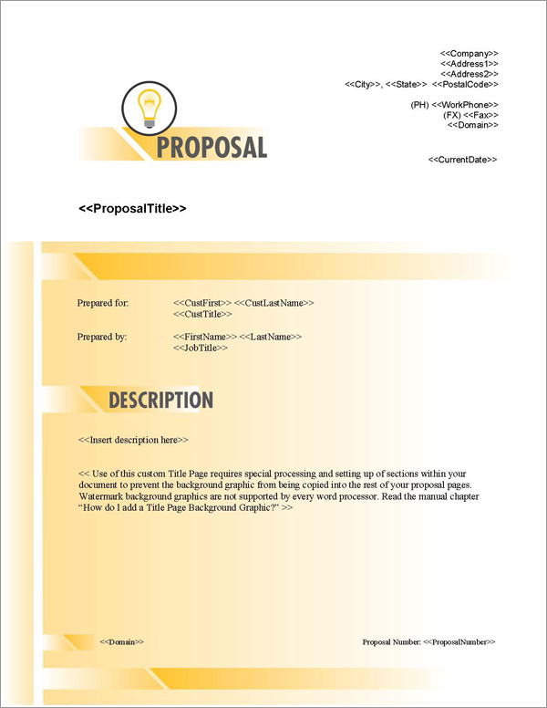 You can customize design elements such as logos, body watermark graphics, custom bullet point graphics, and Title Page graphic designs. Proposal Packs include the original artwork graphics to make it easier for you to customize our Proposal Pack visual themes. This type of customizing requires graphic design work using your own graphics editing software. We also provide services to customize Proposal Pack graphic themes.