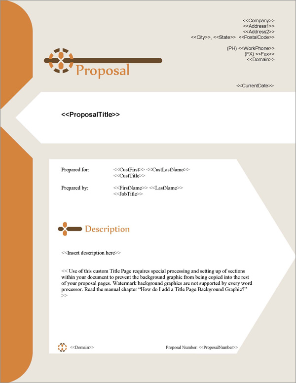 You can customize design elements such as logos, body watermark graphics, custom bullet point graphics, and Title Page graphic designs. Proposal Packs include the original artwork graphics to make it easier for you to customize our Proposal Pack visual themes. This type of customizing requires graphic design work using your own graphics editing software. We also provide services to customize Proposal Pack graphic themes.