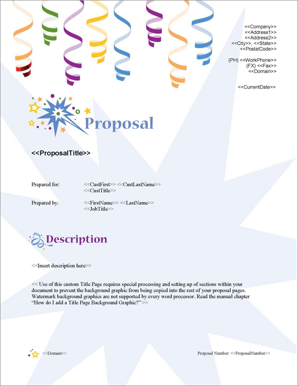 Proposal Pack Entertainment #2 is a specialty graphic logo design which accents our entire collection of over 2200 business proposal templates. You get a custom design theme consistently integrated through every page of your proposal. We have done most of the work for you already - pre-written proposal letters, contracts and documents complete with graphic designs and title page backgrounds and sample proposals which show you how to create yours.
