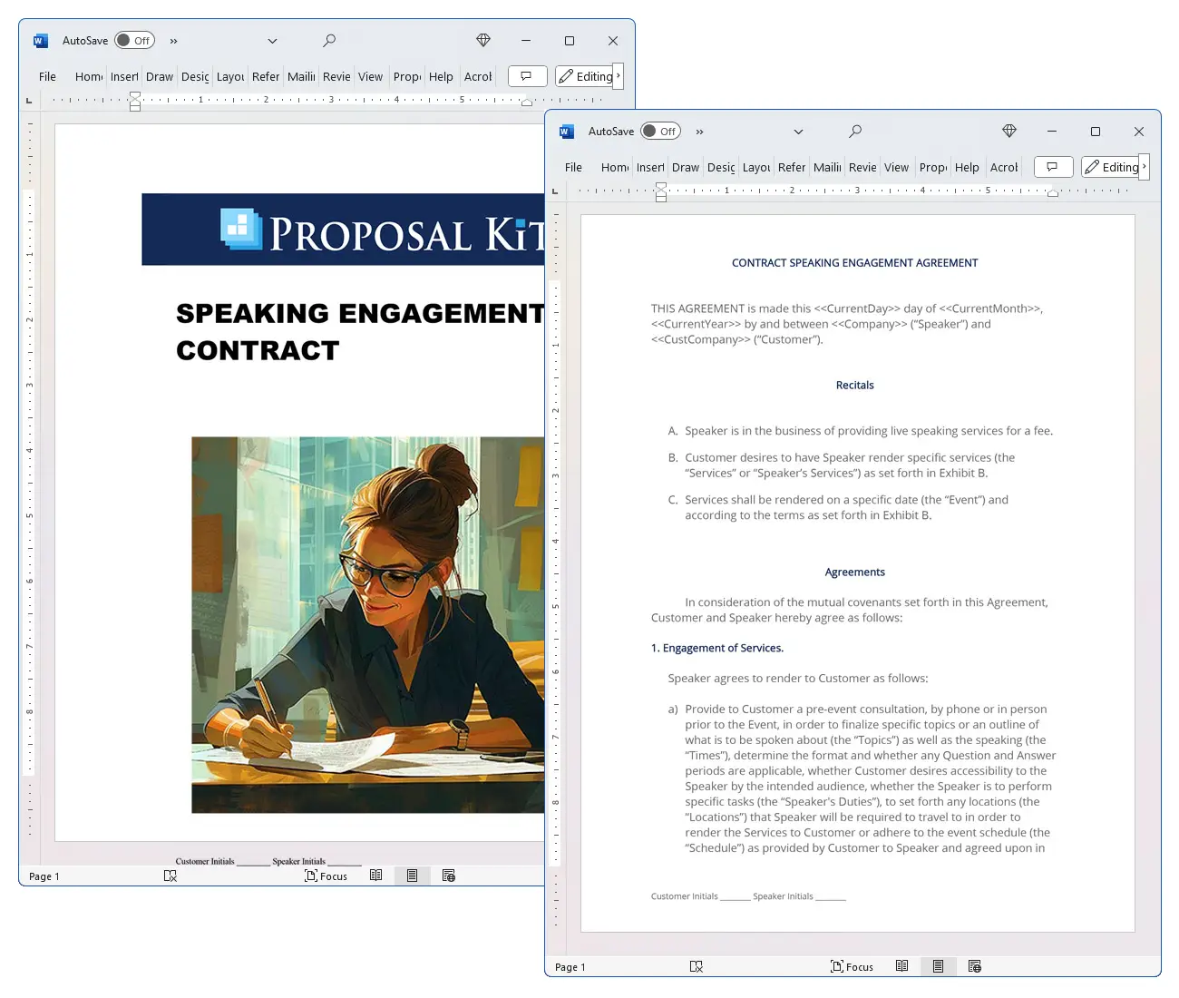 Proposal Kit can make this easier by standardizing clause options for intellectual property, cancellation policy, purchase order references, travel and accommodation details, and tax documentation. Teams can assemble an entertainment contract package, configure deposit and balance, refunds and forfeiture, and add force majeure and liability insurance language from its template library. The AI Writer helps create guest profiles, room setup specifications, speaker introductions, marketing and promotion, and travel policy addenda so business users can deliver a consistent, easy-to-use agreement set.