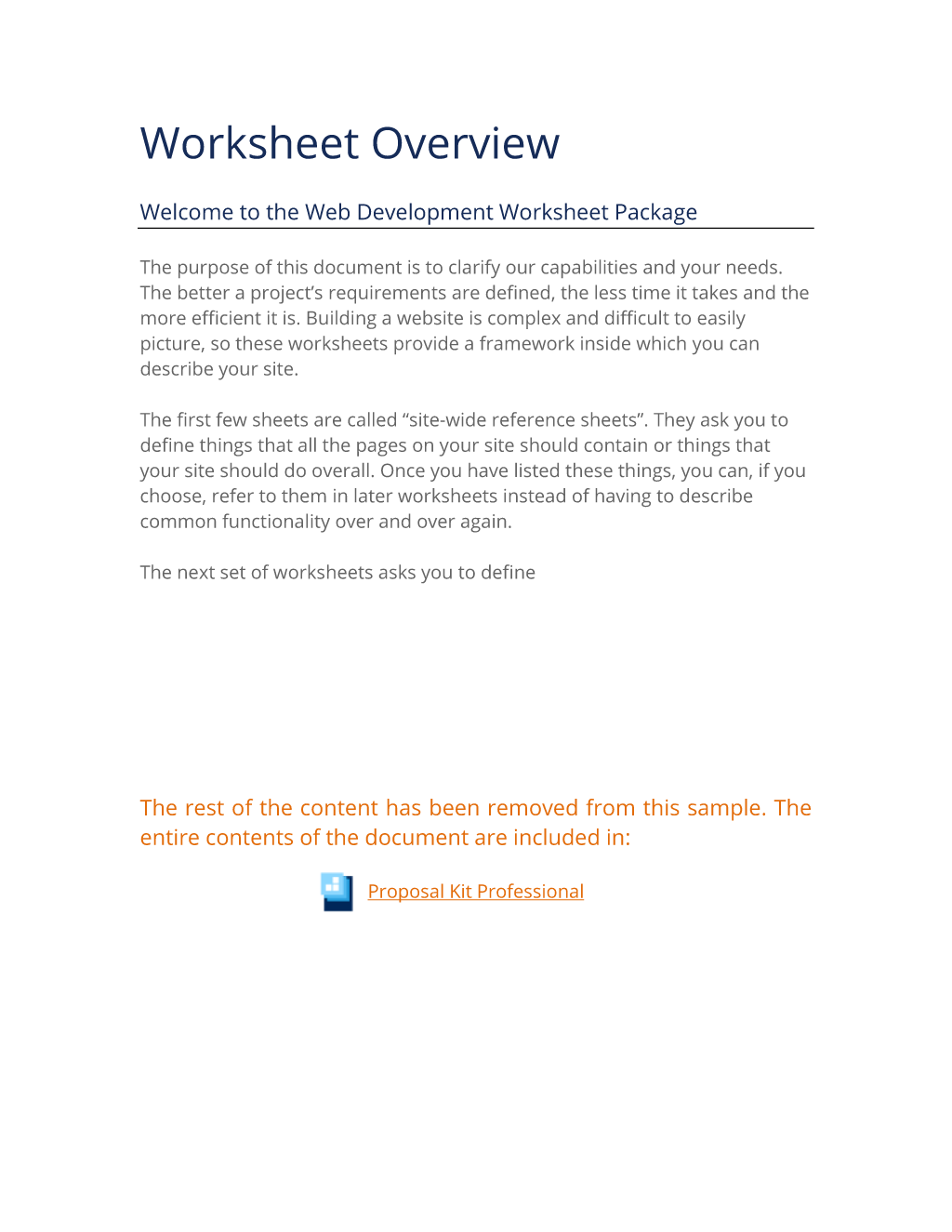 Published by Proposal Kit, Inc.We include a library of documents you can use based on your needs. All projects are different and have different needs and goals. Pick the documents from our collection, such as the Web Development Worksheet Overview, and use them as needed for your project.