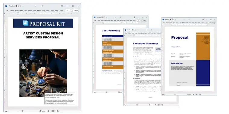 A proven solution to creating a winning artist custom design services proposal is to use the Proposal Kit template and software package. This comprehensive and customizable system not only provides a wide array of template options but also incorporates a line item quoting database system for detailed cost summaries, quotes, estimates, budgets, and other financial topics, ensuring your proposal is both professional and complete. If you need to write a proposal for custom design services, whether you're a jeweler, painter, sculptor, or creative artist, the Proposal Kit is your tool.