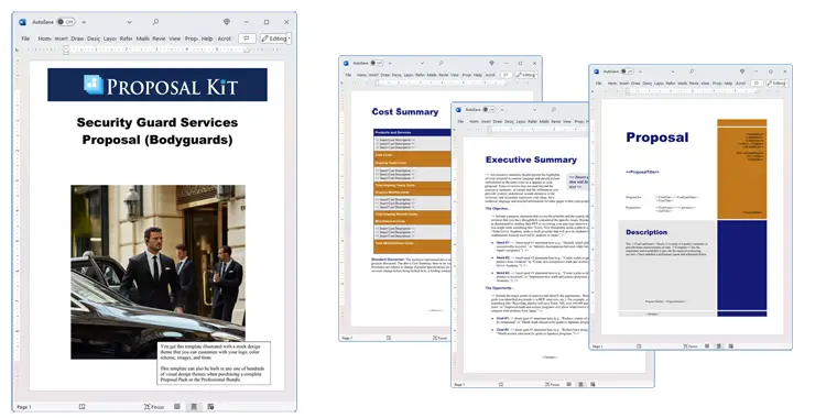 Creating a comprehensive proposal for security guard services that meets the specific needs of a client can be demanding. However, a proven solution is using the Proposal Kit template library and Wizard software program. This robust system not only offers templates tailored for security services proposals but also integrates a line item quoting database system. This important feature assists in managing cost summaries, quotes, estimates, budgets, and other financial topics, ensuring your proposal is both complete and competitive.