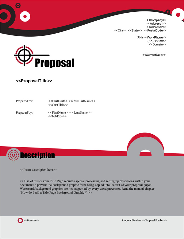 You can customize design elements such as logos, body watermark graphics, custom bullet point graphics, and Title Page graphic designs. Proposal Packs include the original artwork graphics to make it easier for you to customize our Proposal Pack visual themes. This type of customizing requires graphic design work using your own graphics editing software. We also provide services to customize Proposal Pack graphic themes.